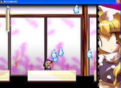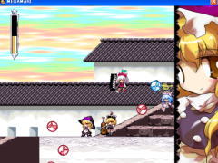 上のボス直前のバウンドてゐの場所で、 てゐの逃走が失敗するという情報を頂きました。 成功する時と成功しない時があり、 実用度はそれほど高くありませんが、 面白い絵なので、一度見てあげてください(^^; 方法としては、 まずバウンドてゐが出るか出ないかの辺り (左図の魔理沙の立ち位置)に陣取り、 ジャンプしながら魔理沙の通常攻撃を連打。 この位置から動かずに倒せれば、 第一段階は成功です。 |